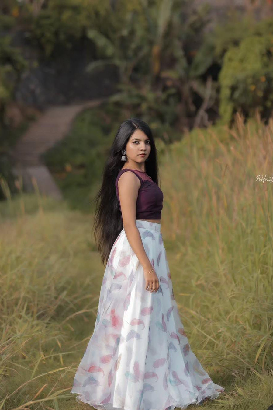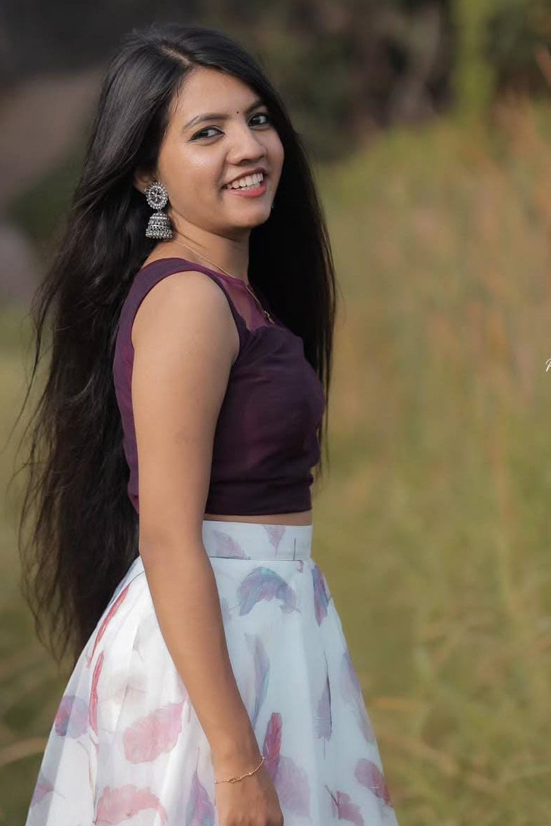 This elegant outfit features a rich plum sleeveless crop top paired with a flowy ivory skirt adorned with soft pastel prints. The top offers a modern yet graceful silhouette, while the lightweight skirt adds a dreamy, feminine charm with every movement. Perfectly blending contemporary style with subtle elegance, this ensemble is ideal for festive gatherings, casual celebrations, and special occasions. Comfortable, stylish, and effortlessly graceful, it’s a beautiful choice for those who love refined fashion with a soft touch.