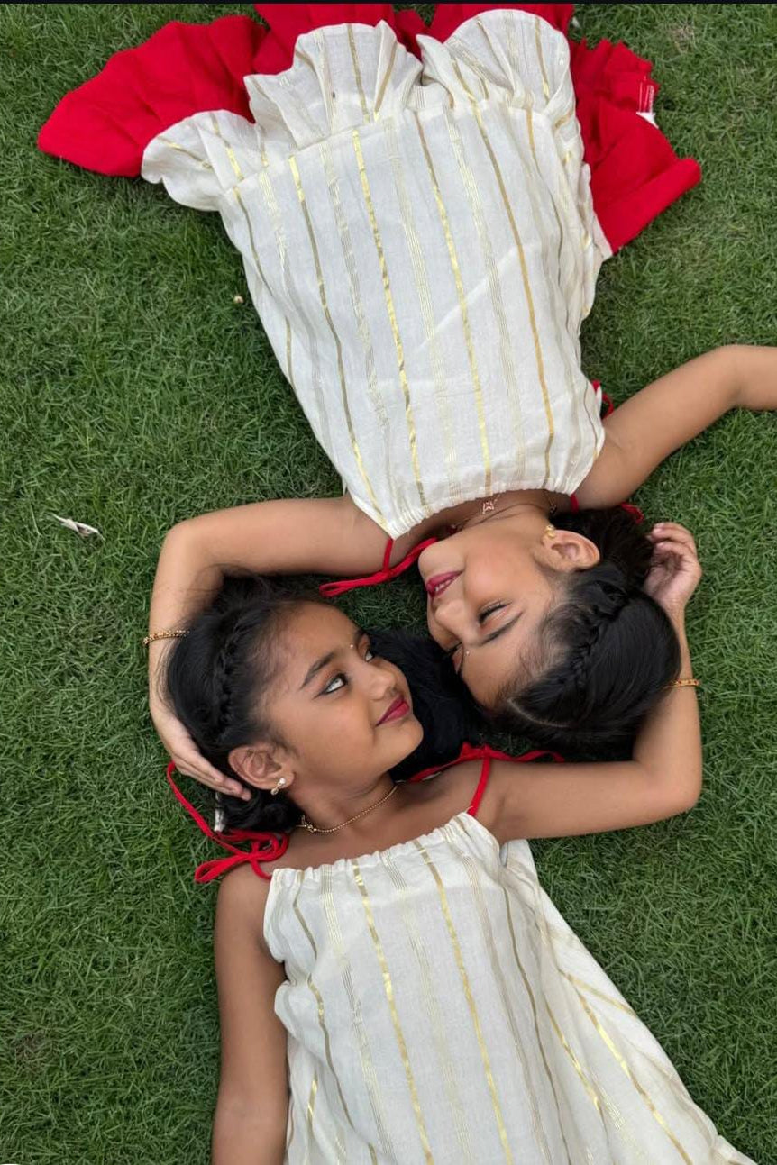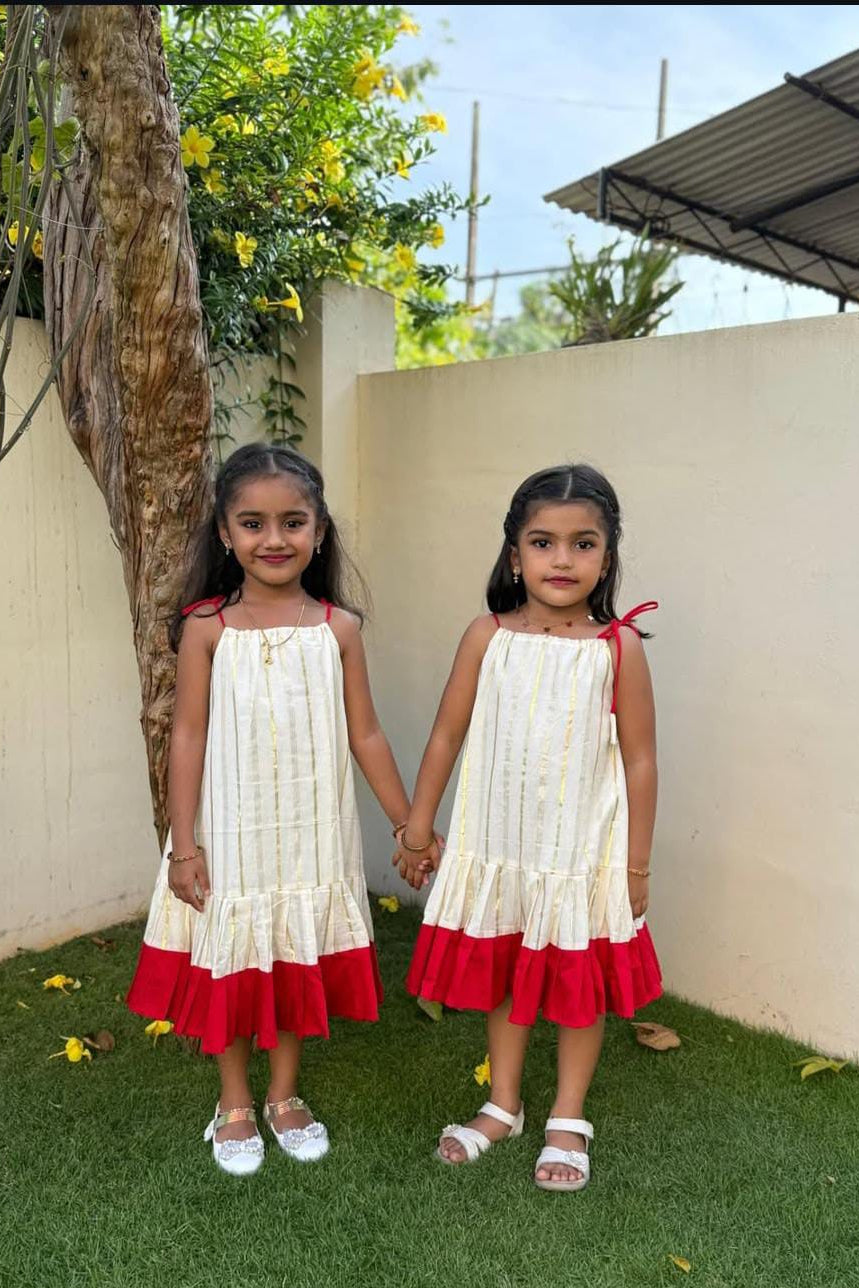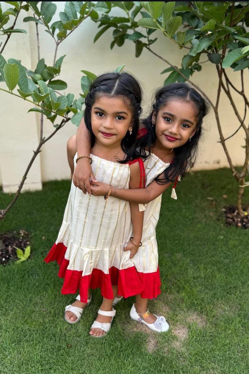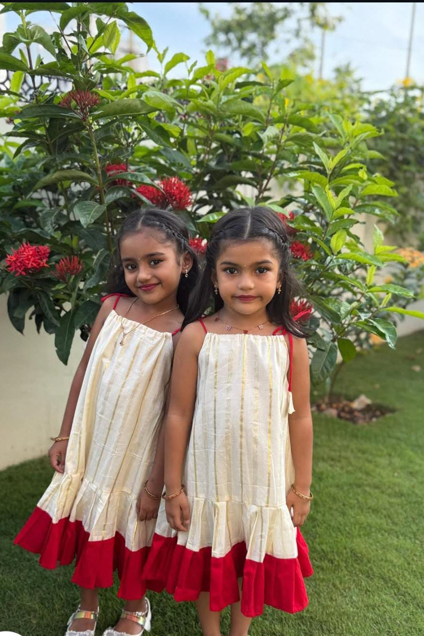 Dress your little one in timeless festive charm with this beautifully crafted cream frock featuring subtle gold stripe detailing. Designed with a soft, breathable fabric for all-day comfort, this outfit is highlighted by a graceful red frill hem that adds a pop of traditional elegance. The shoulder tie-up pattern with cute tassel accents gives a playful touch, making it perfect for festivals, family functions, and special celebrations. Lightweight and comfortable, this frock blends classic style with modern comfort—ideal for your little princess’s joyful moments.