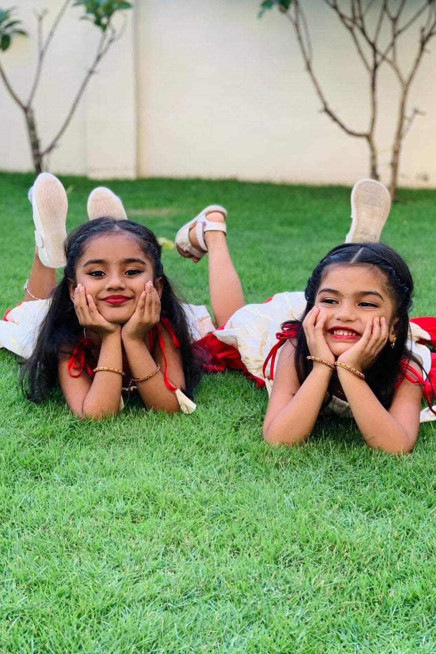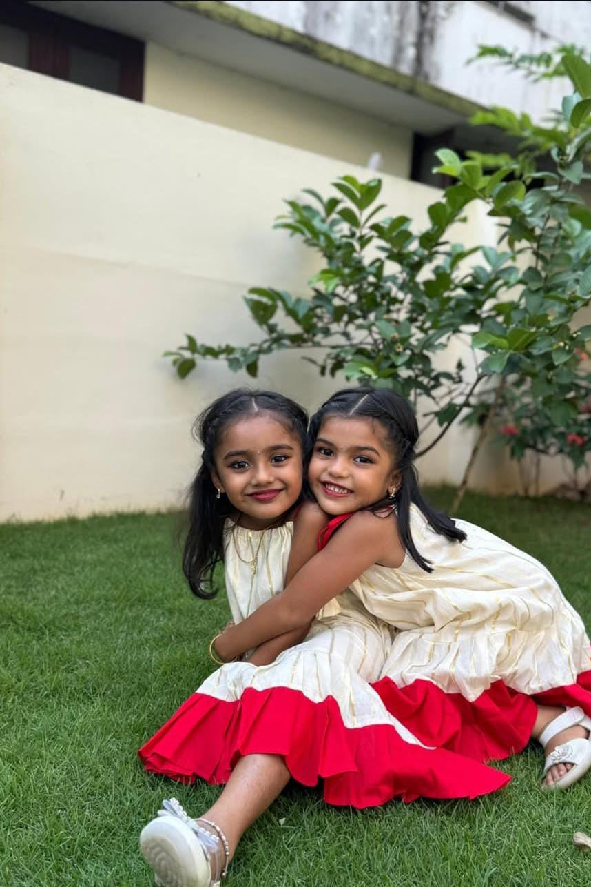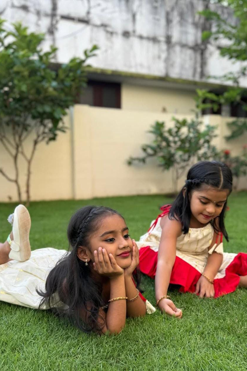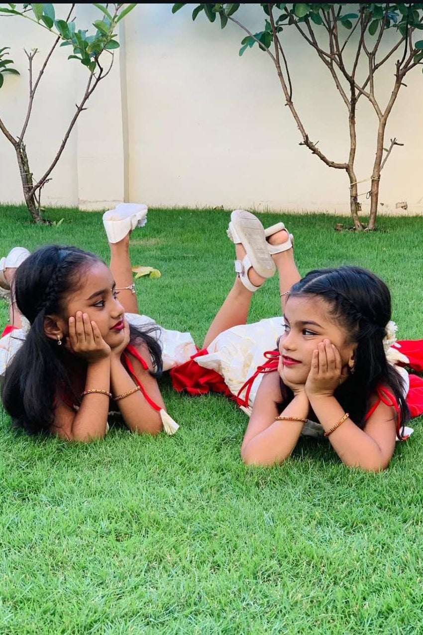Dress your little one in timeless festive charm with this beautifully crafted cream frock featuring subtle gold stripe detailing. Designed with a soft, breathable fabric for all-day comfort, this outfit is highlighted by a graceful red frill hem that adds a pop of traditional elegance. The shoulder tie-up pattern with cute tassel accents gives a playful touch, making it perfect for festivals, family functions, and special celebrations. Lightweight and comfortable, this frock blends classic style with modern comfort—ideal for your little princess’s joyful moments.
