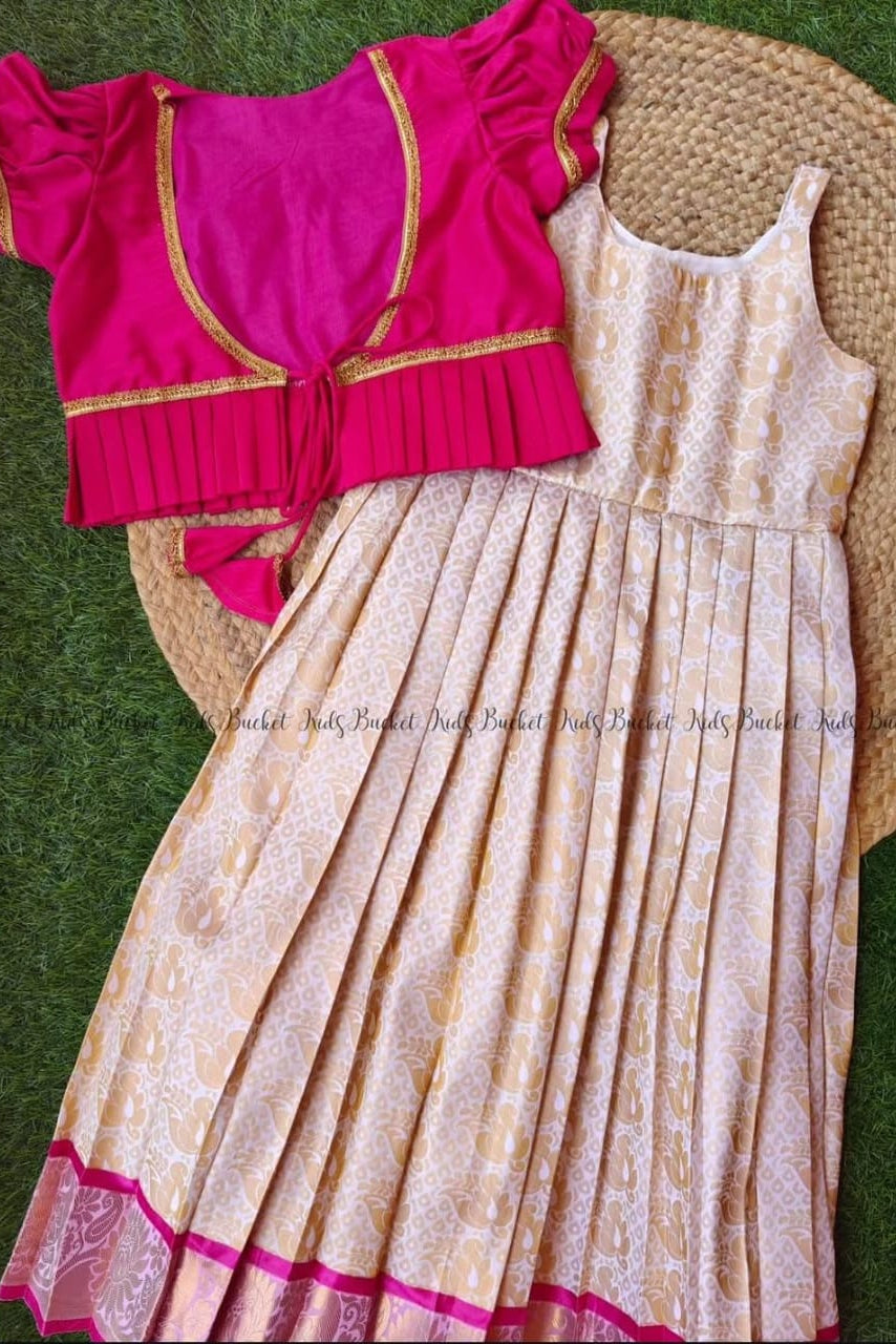 Dress your little one in timeless elegance with this beautifully crafted traditional pavada set. Featuring a soft cream pavada adorned with delicate woven motifs and a graceful pink border, this outfit is paired with a rich pink blouse highlighted by fine gold detailing and pleated accents. The harmonious blend of subtle tones and vibrant pink adds a festive charm, making it perfect for special occasions. Designed for comfort as well as style, the flowing pavada allows easy movement, while the blouse offers a snug yet comfortable fit. Ideal for weddings, festivals, family functions, and celebrations, this outfit brings together tradition, grace, and childhood charm in the sweetest way. ✨🌸