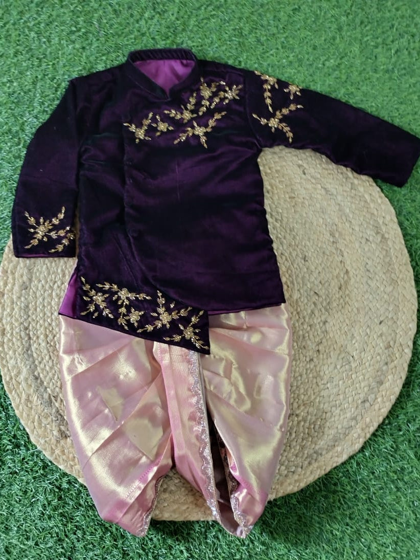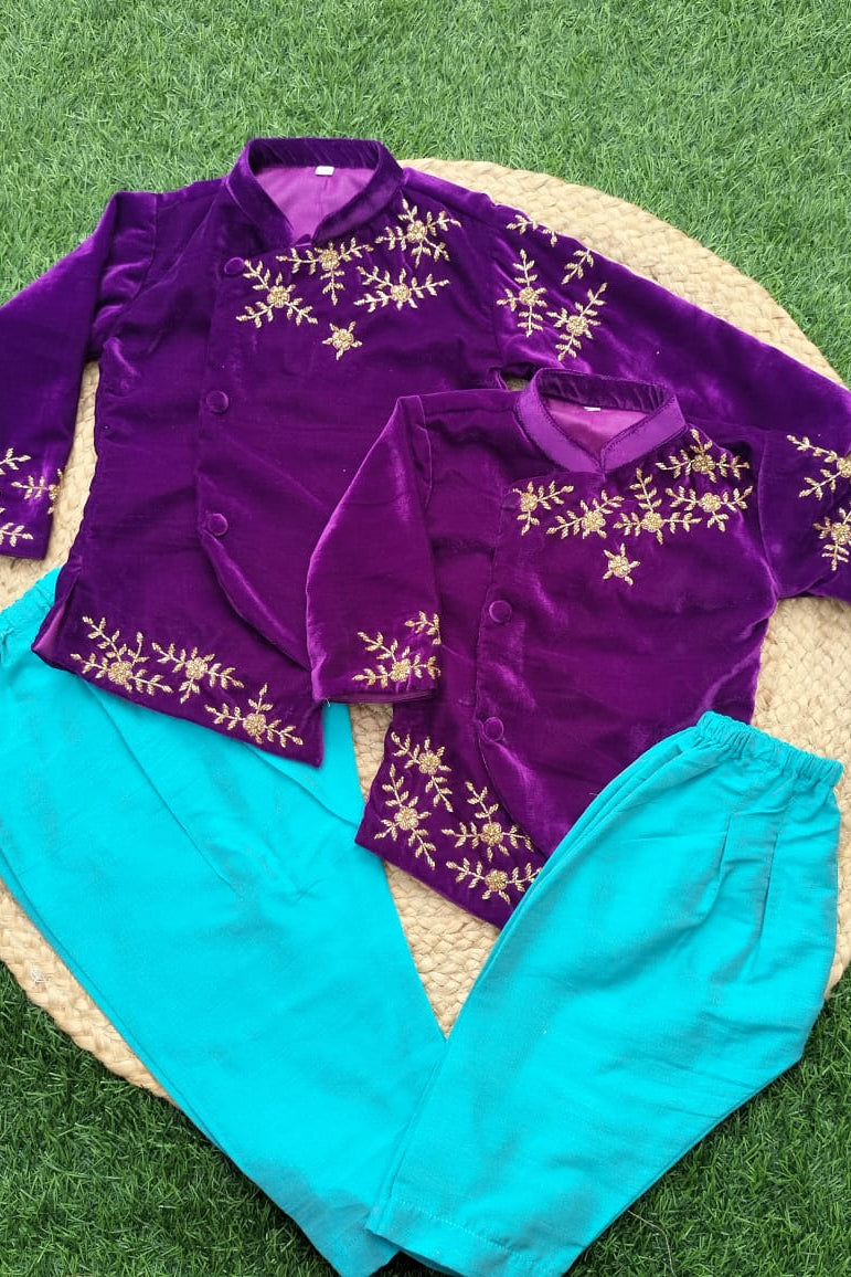 Let your little one shine in regal charm with this beautiful Embroidered Kurta & Dhoti Set. The rich VioletKurta is elegantly adorned with delicate floral embroidery, adding a touch of royal sophistication. Paired with a contrasting aqua blue dhoti featuring matching embroidered detailing, this outfit creates a striking blend of colour, tradition, and style.