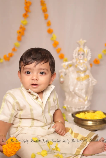 Dress your little one in timeless Kerala elegance with this adorable kids’ shirt and mundu set. Designed in soft cream fabric with subtle golden stripes, this outfit blends tradition with comfort—perfect for festivals, temple visits, photoshoots, and special family occasions. The short-sleeve shirt features a classic collar and matching striped detailing that beautifully complements the kasavu mundu. Made from breathable, skin-friendly material, this set keeps your child cool, comfortable, and stylish all day long.