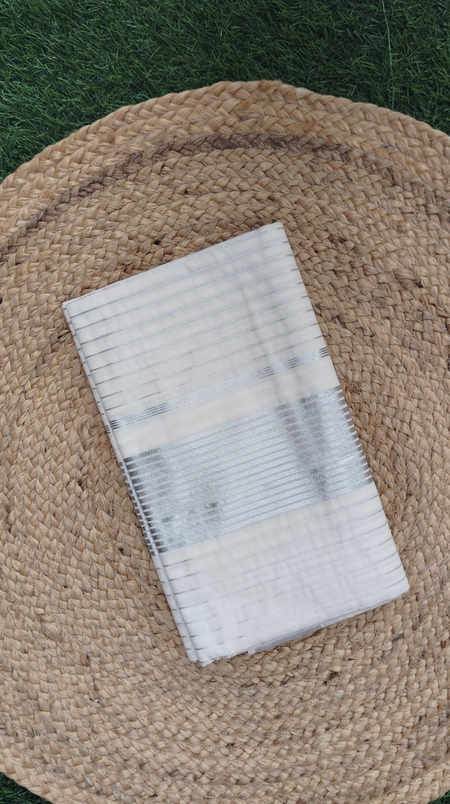 A perfect blend of simplicity and shine, this cotton kasavu saree comes adorned with soft silver lines and a beautifully woven silver border. The pure white body keeps the look classic and graceful, while the silver detailing adds a cool, sophisticated sparkle.