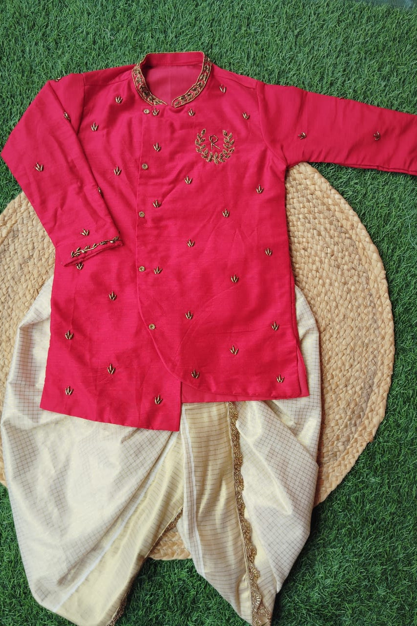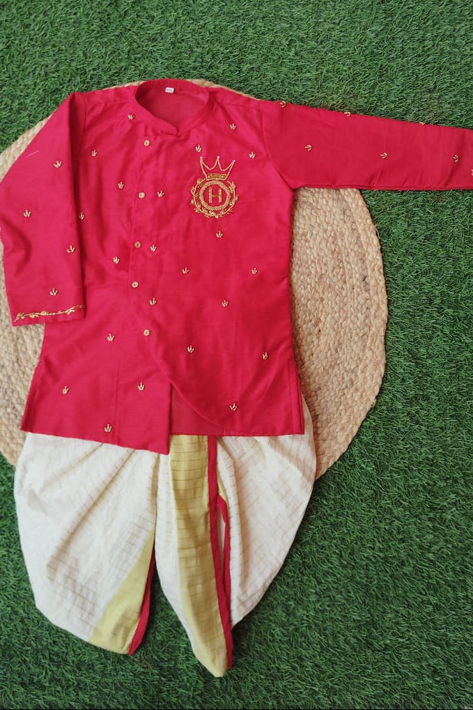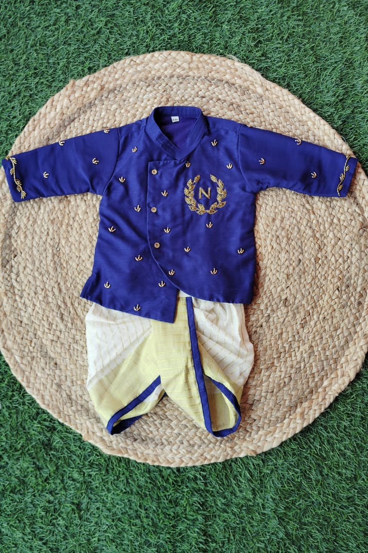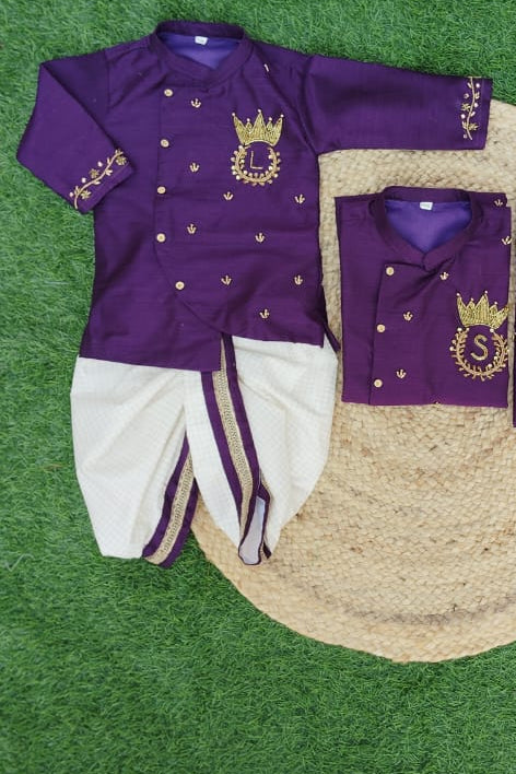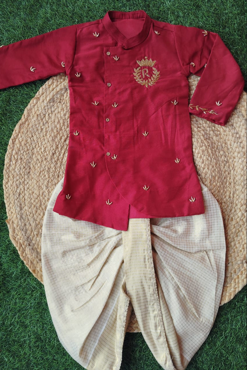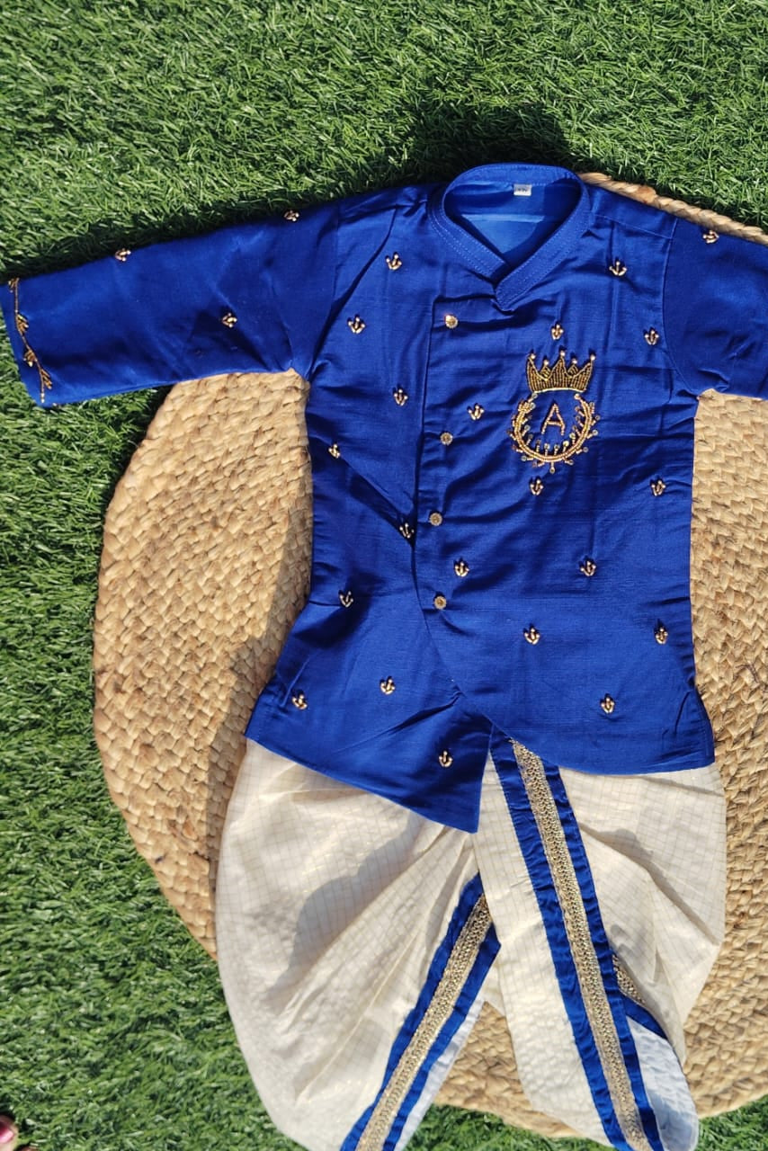 Dress your little one in timeless festive charm with this elegant Letter Work Kurta & Dhoti set. Crafted from soft, breathable fabric, the kurta features delicate all-over embroidery with a beautifully highlighted custom letter motif, adding a personalized and royal touch. The classic neckline and neat button detailing enhance its traditional appeal. Paired with a comfortable off-white dhoti finished with a subtle golden border, this set offers both style and ease of movement. Perfect for weddings, festivals, naming ceremonies, birthdays, and special occasions, this outfit blends tradition with modern elegance—making your child look graceful and picture-perfect all day long.